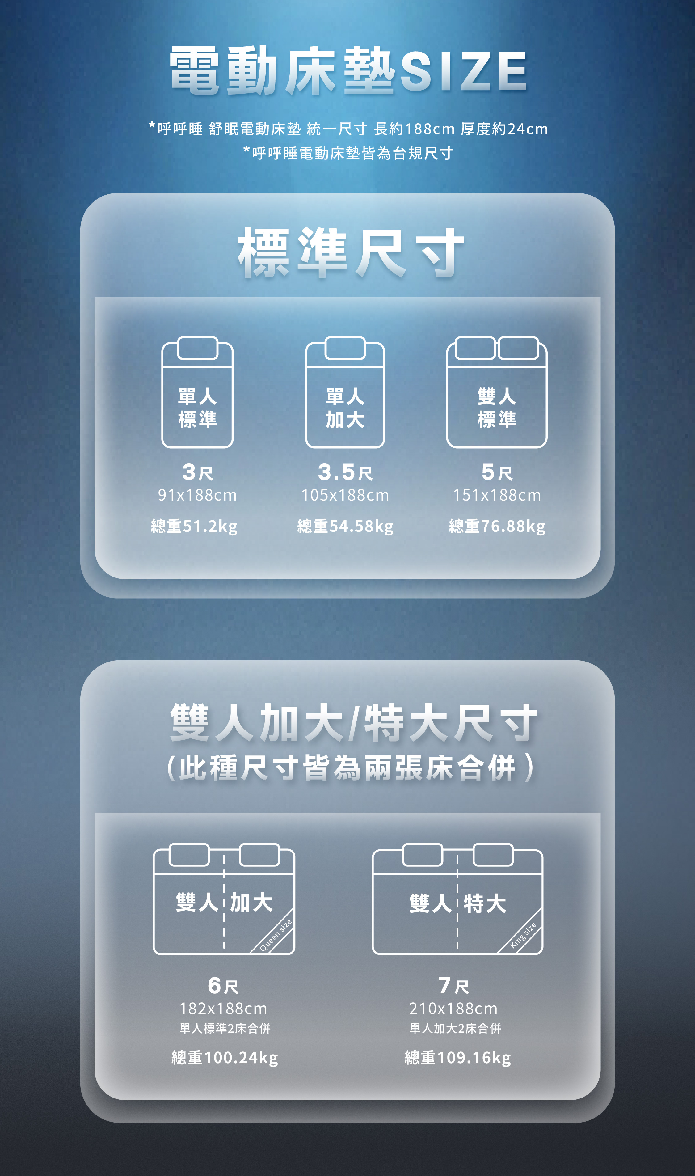 舒眠電動床墊5種尺寸