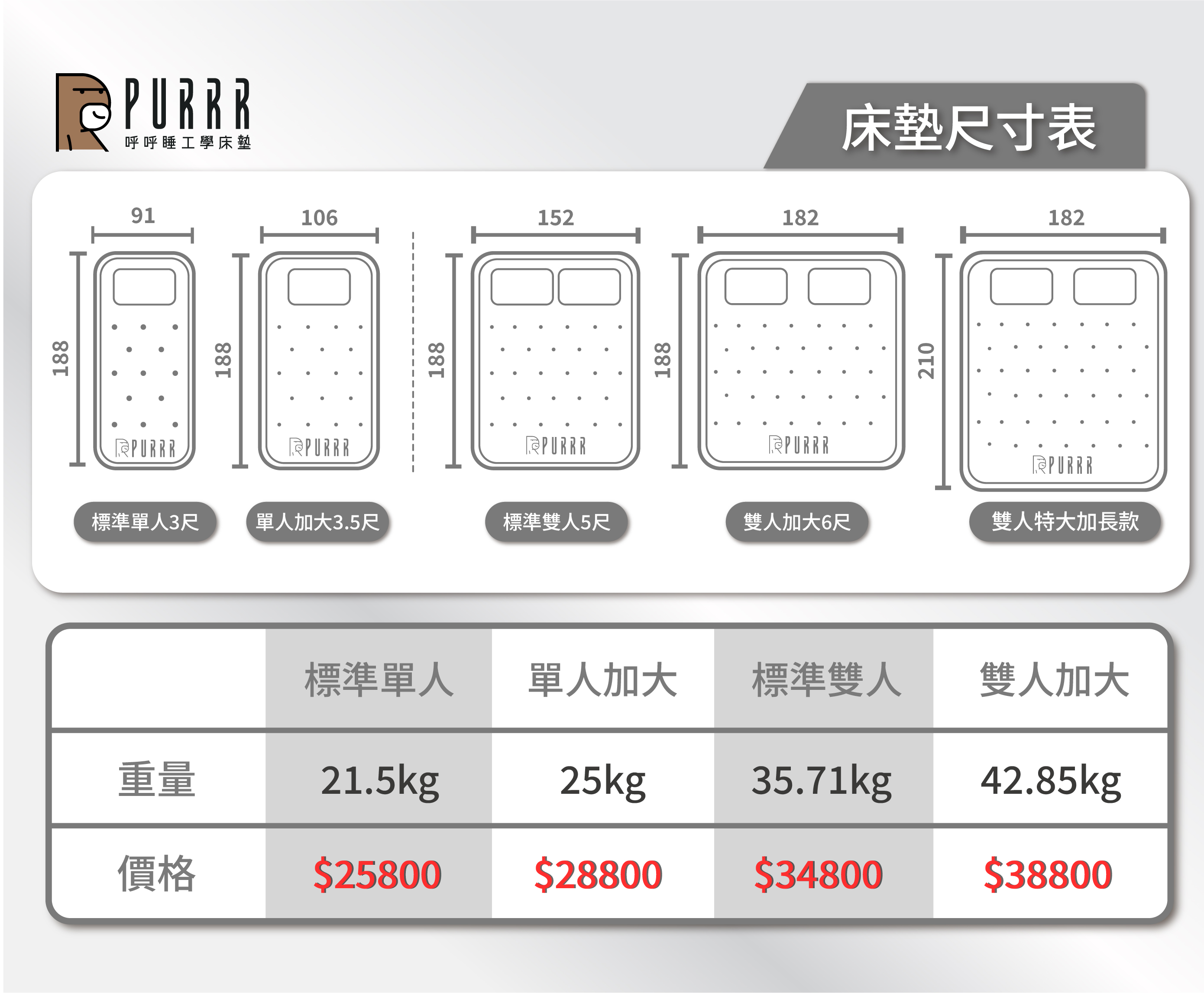 床墊尺寸與重量一覽表