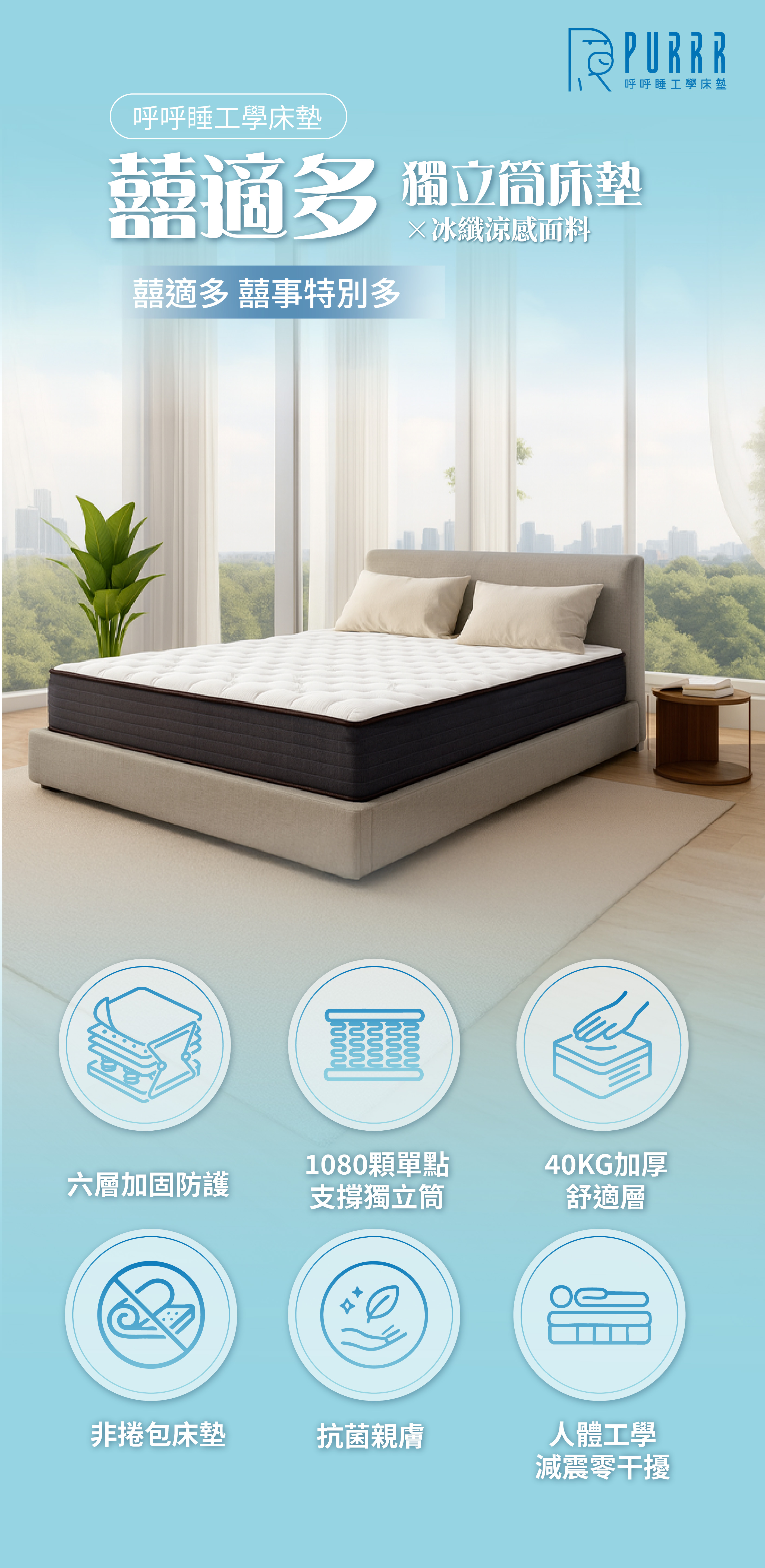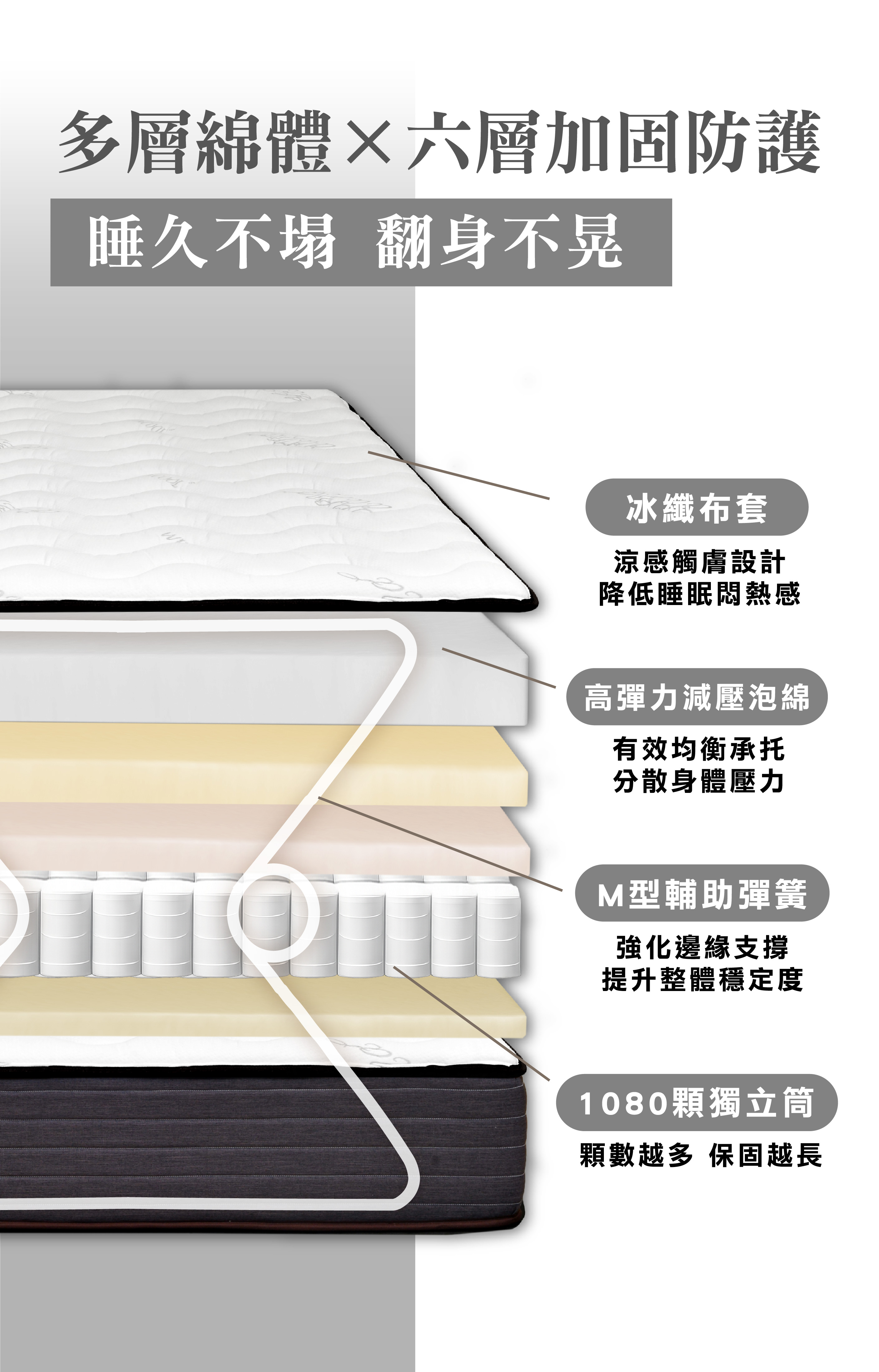 - 獨立筒床墊: 擁有六道加固防護,有效提升耐用度,並依不同產品屬性提供最佳睡眠效果。